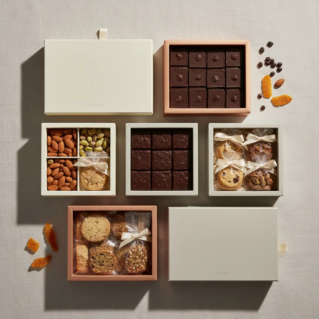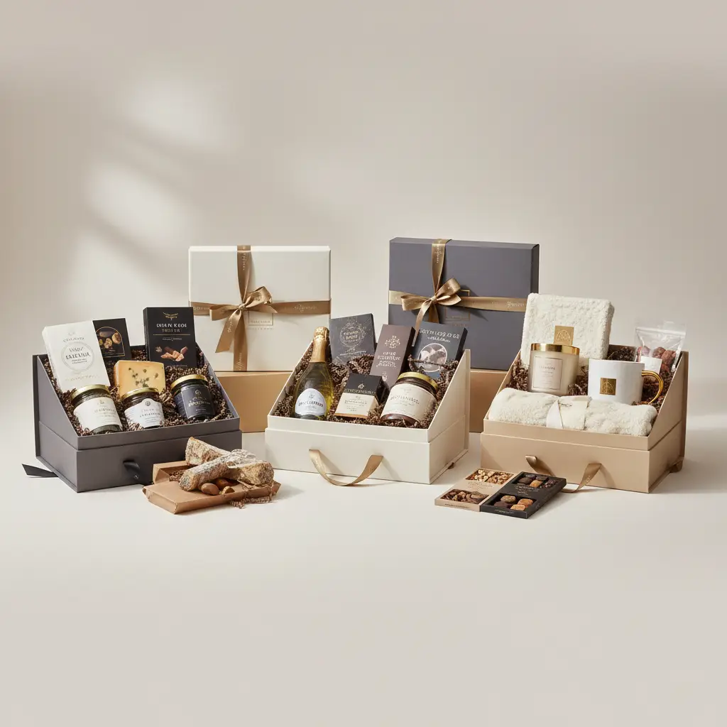 A wide selection of premium hampers featuring gourmet products, elegant packaging, and refined presentation.